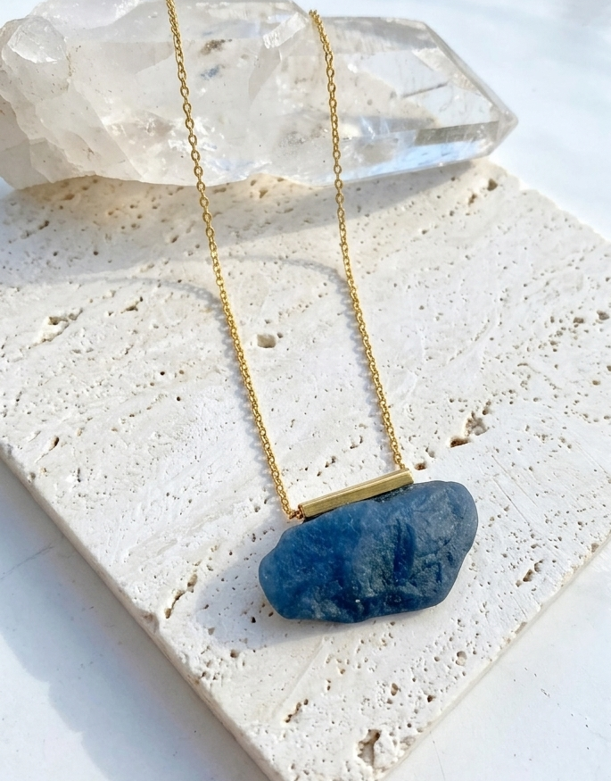 Apresentamos o nosso colar em aço inox dourado com a presença serena do Quartzo Azul. Mais do que um acessório, esta peça é um convite à calma e à clareza mental.