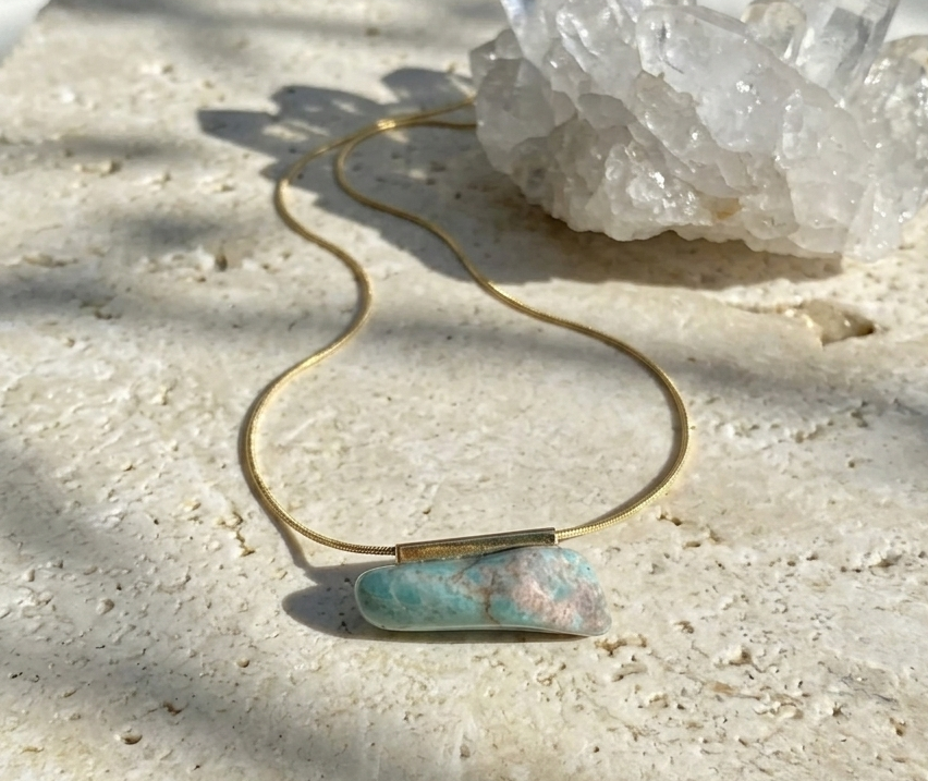 Pedra: Amazonita natural, preservando sua coloração verde-azulada e textura original.